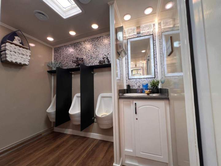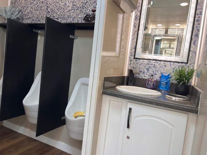 Las cabinas con aire acondicionado crean un refugio fresco del sol de Florida, mientras que la música suave añade un toque extra de relajación. Diseñado para reuniones de hasta 700 personas, este lujoso baño de alquiler garantiza que todos los aspectos de su evento reflejen sofisticación y clase.